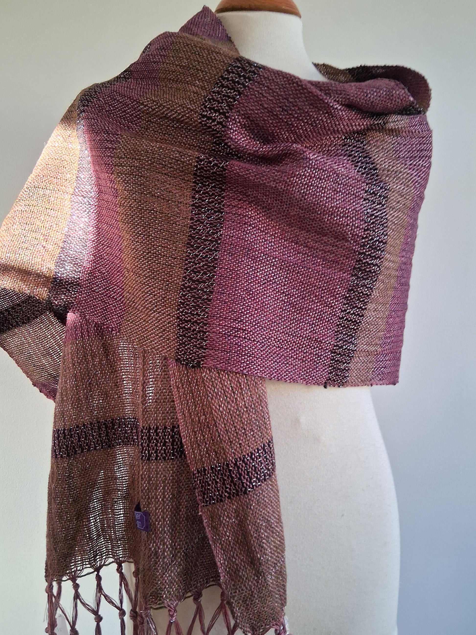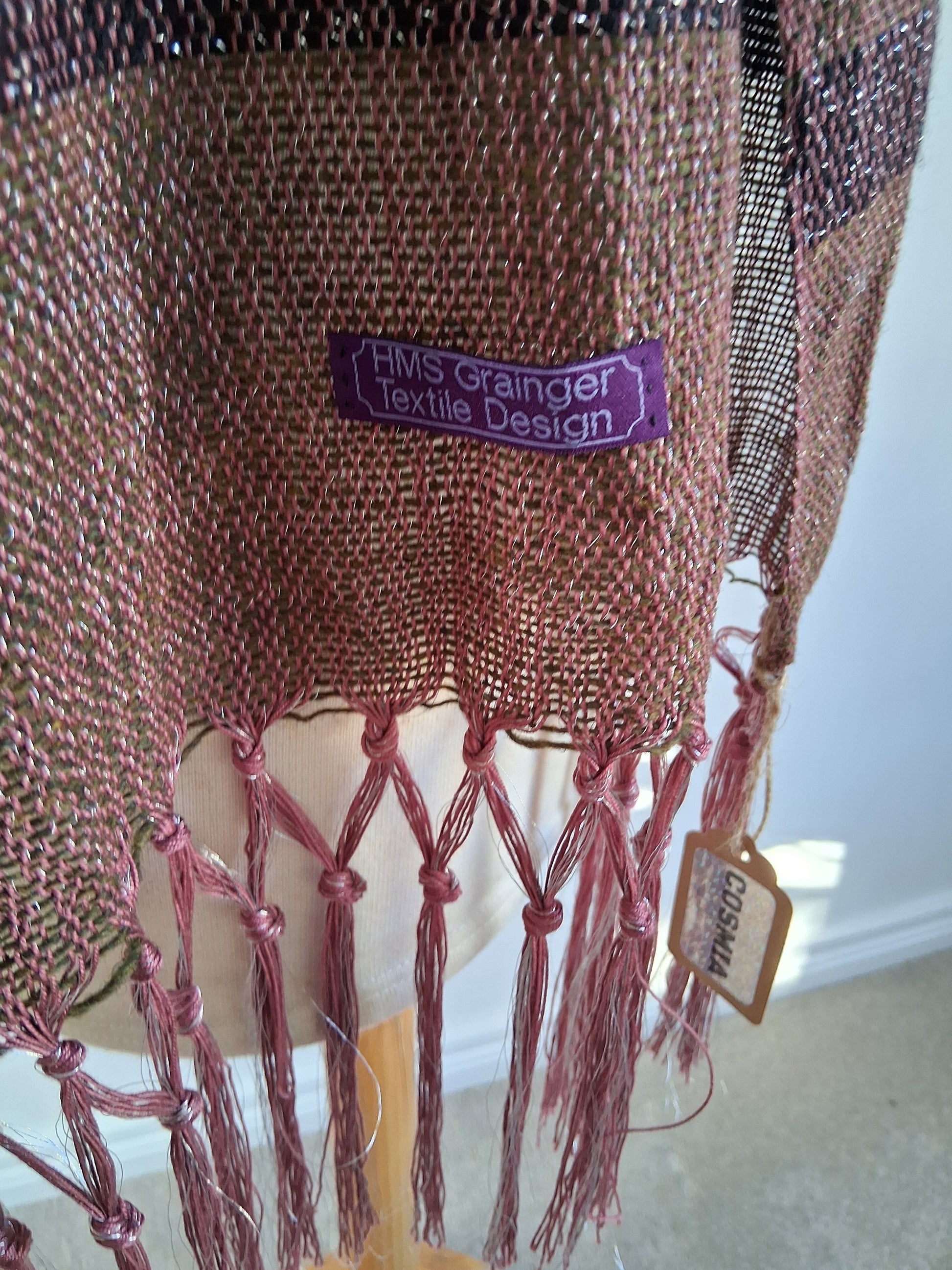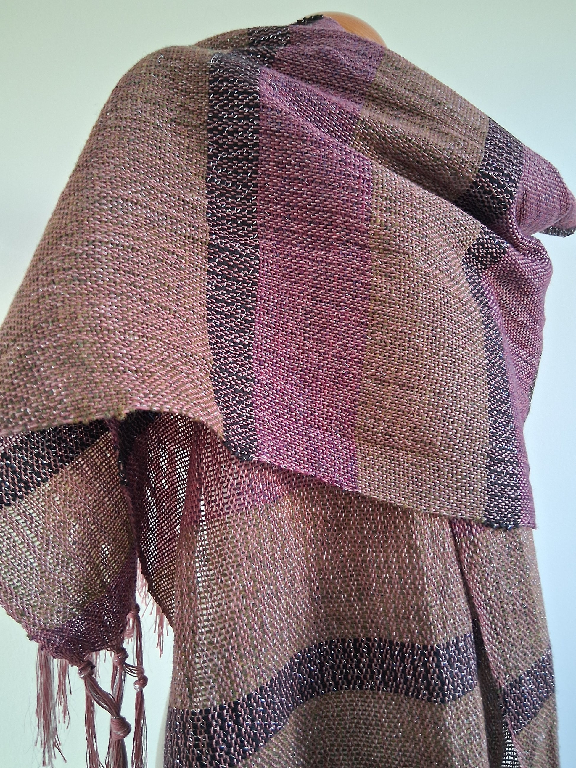 Cosmia Collection ... see the silver sheen in this design. Like wearing psychedelic camouflage, this piece is Khaki, Mulberry with a stripe of noir.